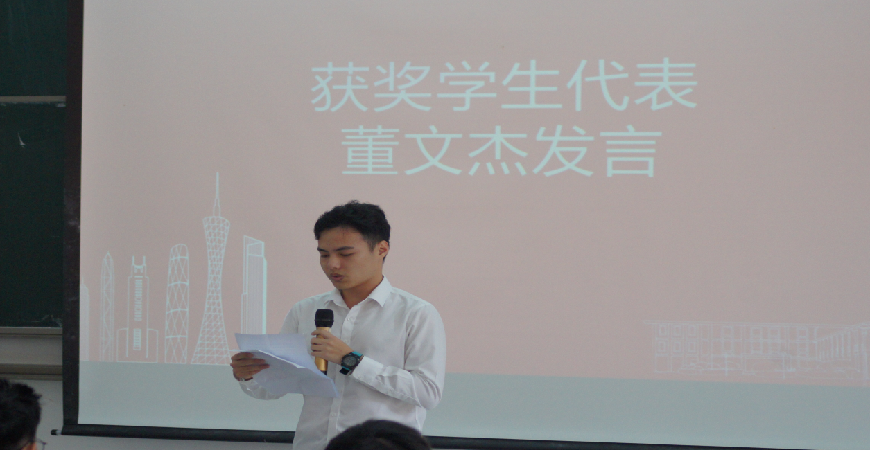 获奖学生代表董文杰进行发言,他表达了对学校和学院的感激之情,分享了自己的学习经验和实践经历,他认为,在学院浓郁学习氛围的熏陶下,自己不仅掌握了知识技能,而且逐步确立了个人志向。他鼓励2023级新生要相信自己,相信当自己遇到挫折时有疏瀹坎壈的能力,相信自己时刻秉持着拳拳之心,相信自己能与骀荡光华相拥!