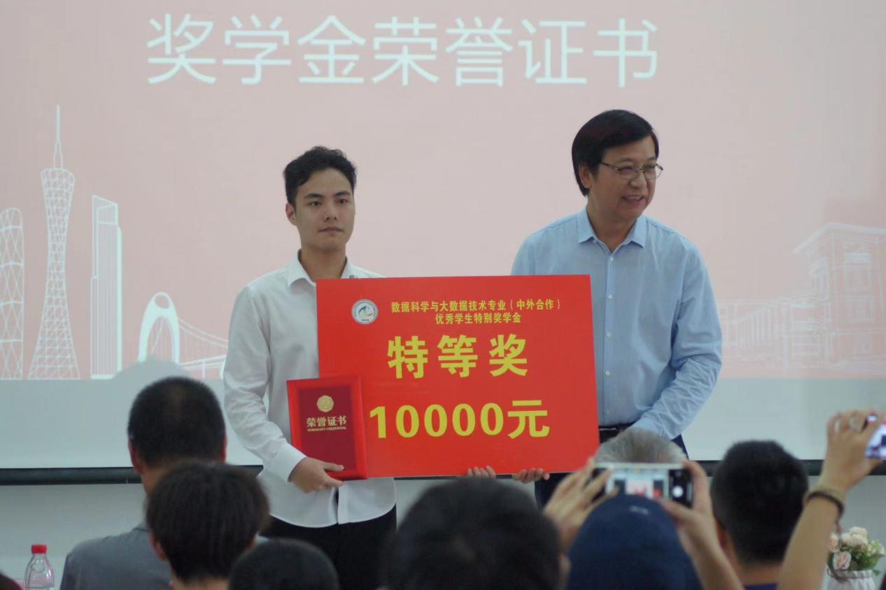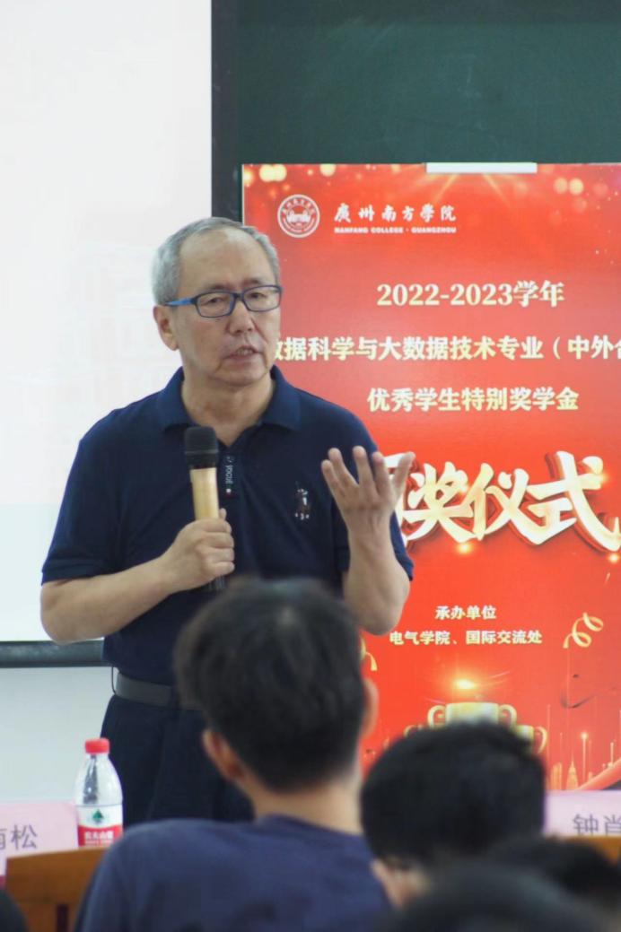 10月25日下午,William威廉官网,William威廉官网2022-2023学年数据科学与大数据技术专业(中外合作)优秀学生特别奖学金颁奖仪式在 2教206 顺利召开。黄南松副校长、教务处钟肖英处长、杨智院长、闵虎副院长、大数据与人工智能系主任詹俦军博士、米登发首席成长导师,以及2022级、2023级数据科学与大数据技术专业中外班全体同学参加了此次颁奖仪式。仪式由2023级朱坤瑶主持。