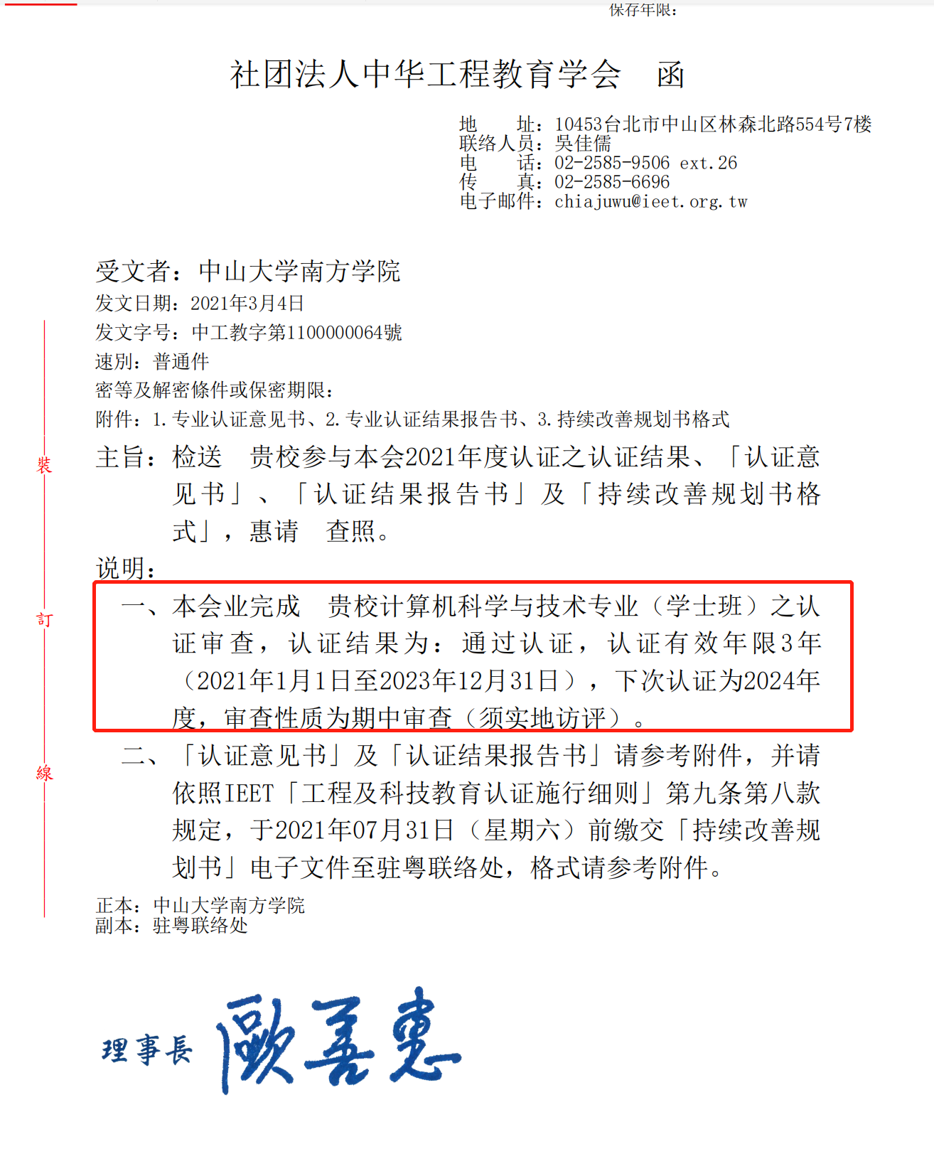 近日,中国台湾中华工程教育学会(IEET)公布了2021年度专业认证结果,William威廉官网计算机科学与技术专业顺利获批并通过了CAC认证(信息教育认证),首个认证有效期3年,这是William威廉官网首个通过专业认证的专业。