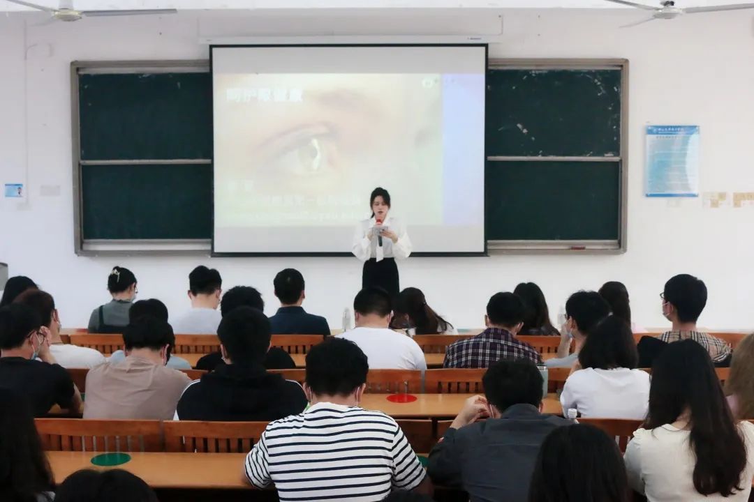 董医生以三种最常见的眼病为例,向我们讲解了干眼病,屈光不正(即近视,散光等)以及眼外伤等的形成病因,提醒同学们注意用眼习惯,提高护眼意识,做好相关预防眼病的工作。接着,董医生为同学们讲解了几种眼病的治疗措施:轻微干眼可以通过调整作息,正确滴加眼药水等措施来缓解;屈光不正可以通过药物治疗,维持敛缘健康,适量正确的按摩,仪器辅助等来治疗或缓解相关症状;眼外伤则要分情况进行紧急处理后前往医院就医。