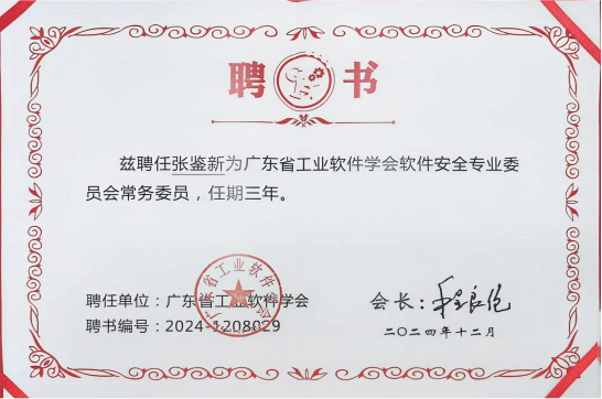 张鉴新副教授被聘为广东省工业软件学会软件安全专业委员会常务委员。广东省工业软件学会软件安全专委会旨在汇聚广东省内软件安全领域的专家学者、企业精英和技术人员,共同探讨软件安全的最新动态、技术发展和行业标准,促进产学研用的深度融合,提高广东省软件产业的整体安全水平。专委会将开展学术交流和技术研讨,推动软件安全标准和规范的制定实施,促进软件安全技术研究与创新,加强与国内外软件安全组织的合作与交流,并提供软件安全咨询,为政府决策和企业发展提供智力支持。