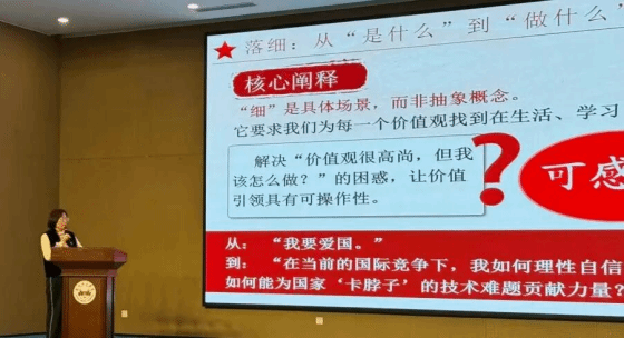 苑俊英教授强调,“落细”是将核心价值观从抽象理念转化为具体行动的关键。她结合富强、爱国、敬业、法治等内容,通过C919大飞机、中国空间站、桂海潮先进事迹等案例,引导同学们将爱国情怀落实到理性自信、学业报国之中;将敬业精神细化到课前预习、课堂专注、课后钻研、恪守学术诚信;将法治意识体现在遵守校规、尊重版权、抵制谣言、维护公平正义。