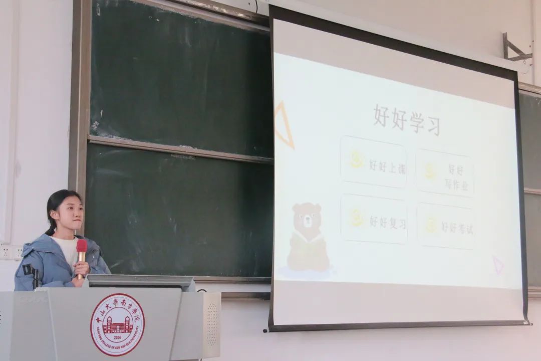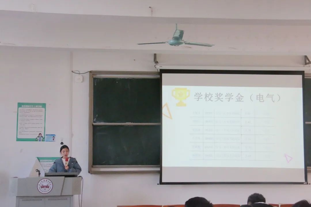 师姐首先分析了本专业学生在校获奖情况,鼓励未获奖的同学努力学习,争取获得优秀学生奖学金;同时希望获奖的同学戒骄戒躁,争取获得国家奖学金。