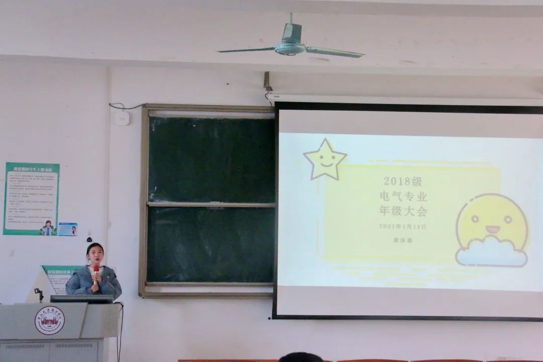 为了更好地备战期末考试以及迎接即将到来的寒假,2021年1月14日中午12:40,2018 级电气工程及其自动化专业于 2教206 召开年级大会。会议由实习辅导员黄泳嘉师姐主持,主要围绕以下四个方面展开。