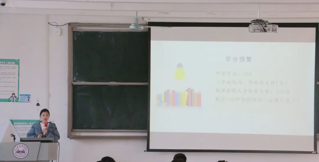 师姐列出了评选国家奖学金所需要的条件,同时指出同学们正处于创作高峰期,要积极发表论文,参加比赛,希望同学们在剩下的大学生活里能珍惜时间,合理安排。随后师姐给大家讲了学分预警的相关事项,师姐提醒本学期考试结束后,同学们拿到的学分应该要有126个学分左右,少于这个数值的同学就要注意在期末结束后对照人才培养方案查找未获得学分的课程。