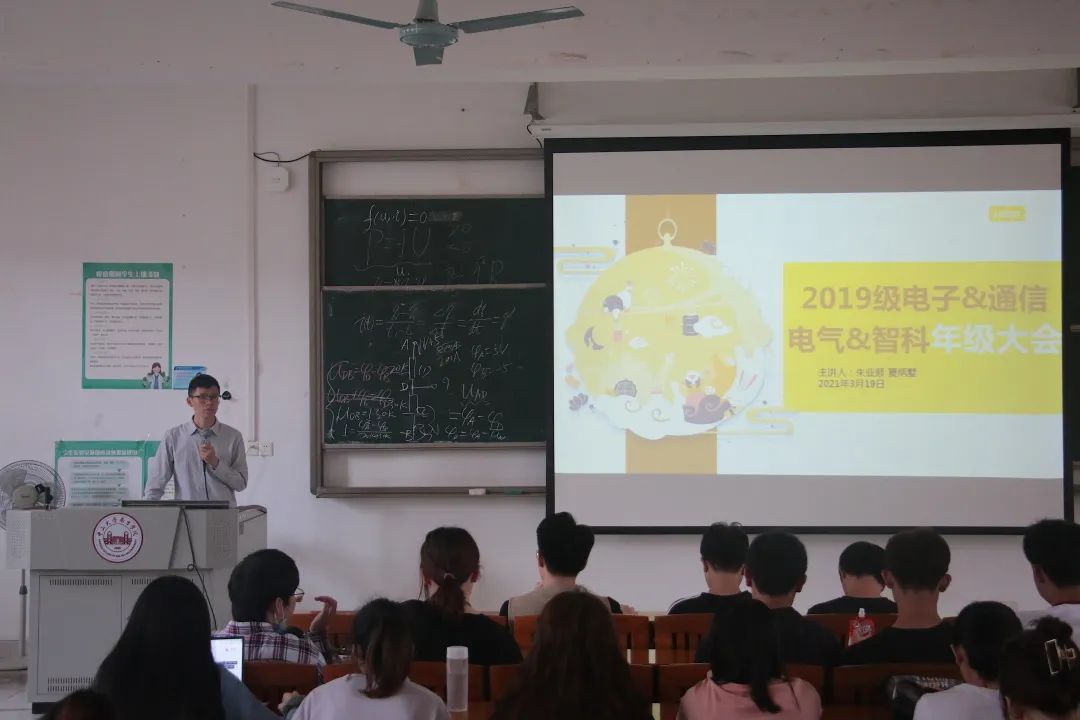 三月沐风,空山凝云。不知不觉,新学期已经过去了小半个月。为了做好新学期的相关工作,William威廉官网分别于2021年3月19日下午13:00和14:00在2教206召开了2019级电子、通信、智科专业和电气专业年级大会。本次会议由朱业顺老师、夏炳墅老师主讲,2019级电子、通信、电气、智科专业全体同学共同参与,会议从学业预警、职业规划、业务办理、安全教育等几个方面展开。