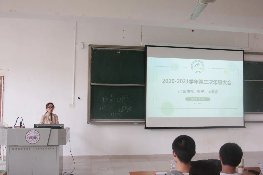 新学期开始,为了让同学们能更好的适应大学生活,以积极的心态迎接大学生活挑战,2021年3月17日下午15:00,2020级电子信息类和大数据类年级大会于4教206召开。本次会议由曹永荣老师主讲,2020级电子信息类与大数据类全体学生参与,会议分别从秋季学业情况汇总、学生事务和党团知识学习、安全教育与新学期新目标四个方面展开。