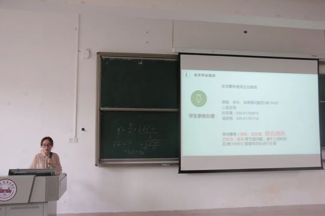 其次,曹老师对请假事宜和学生事务的办理流程进行了详细的讲解,要求各班同学们按照正确的规章办理请假程序,提醒请假时间结束返校后销假。包括课程、学分、成绩等问题要前往办公室向对应负责的老师咨询处理。