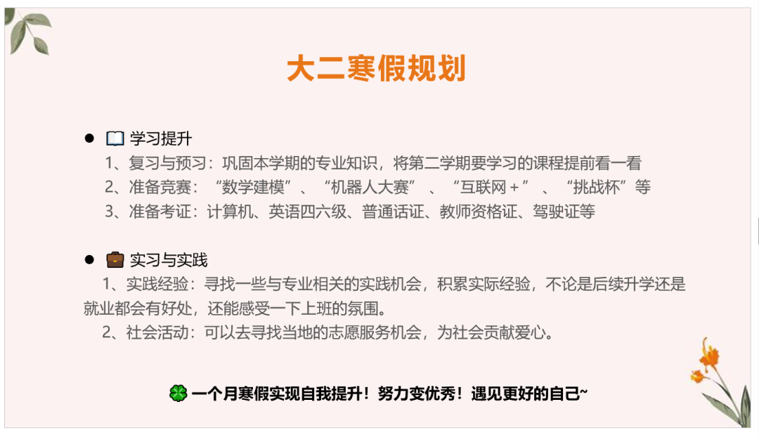 作为大二的学生褪去了大一的青涩,在这个充满自信和热情的年纪,如何让自己的寒假过的充实有意义?王老师建议同学们从学习提升和实习实践两个方面着手,巩固所学知识,预习下学期的知识,准备竞赛与考证,积累实际经验,努力变优秀,遇见更好的自己。