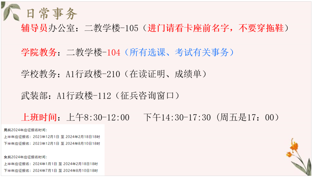 为了再一次加深同学们对学校日常事务的了解,王老师详细介绍了相关部门的工作地点、工作内容及时间安排,此外有征兵需求的同学也可以找到学校武装部进行咨询。