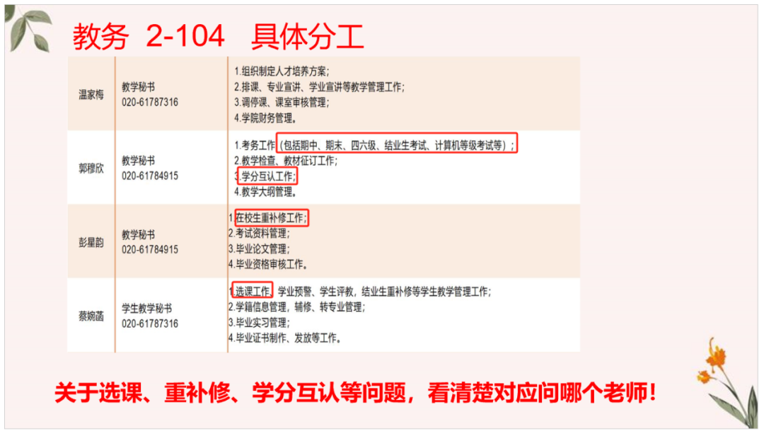 特别对于学业相关的问题,如选课、重补修、学分互认等,同学们需要找对应的教学秘书咨询,学院官网有老师们的联系方式。