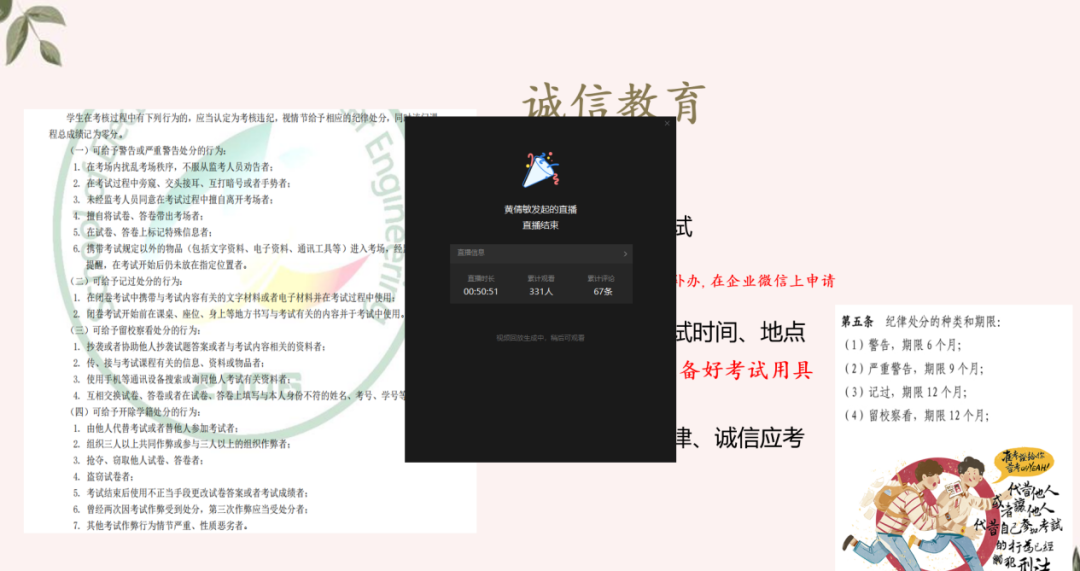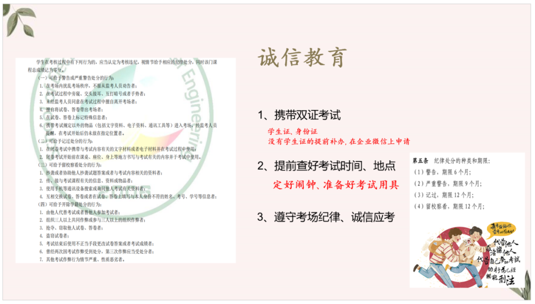 会议中,王清楠老师强调了考试相关的注意事项,携带学生证与身份证参加考试;提前了解考试时间和地点,定好闹钟,不要忘记参加考试;遵守考场纪律,诚信应考。