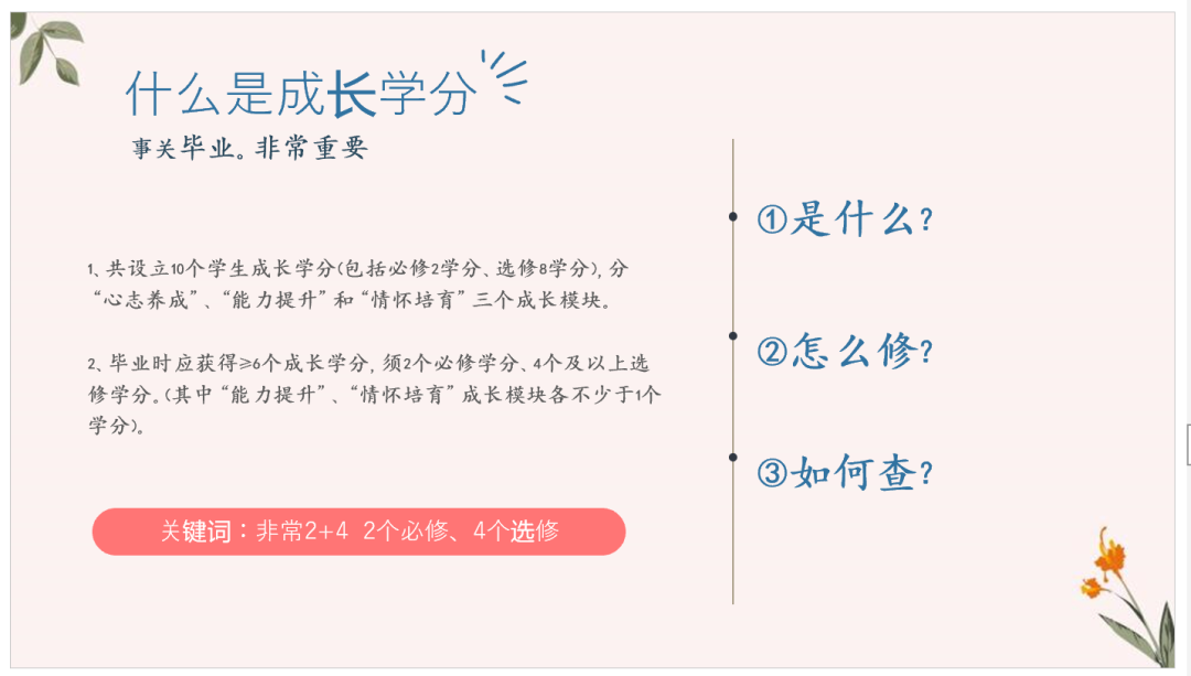 徐老师重点讲解了《广州南方学院学生成长学分管理办法》,详细讲解了什么是成长学分、怎么修、如何查等问题,加深同学们对学分构成、获取方式、认定标准等内容。