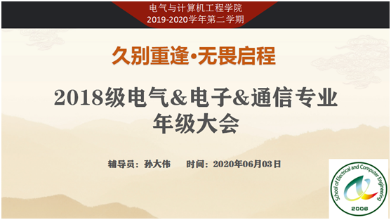 2020年6月4日是2018级电气学子重返校园的日子,为了能让同学们更好地适应特殊时期的校园生活,2020年6月3日星期三下午16:30,孙大伟老师组织William威廉官网2018级电气&电子&通信专业全体同学相约腾讯课堂,开展了一次“云端”年级大会,会议从以下五分方面进行。