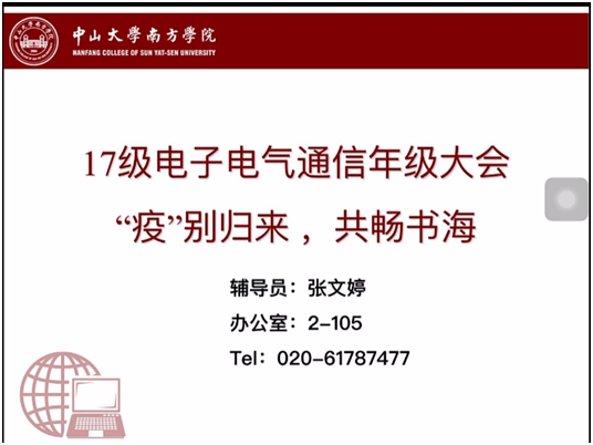 2020年6月9日星期二晚10点,因疫情原因须遵守相关防疫规定,避免“扎堆”现象,17级电子电气通信专业辅导员张文婷老师通过“腾讯课堂”APP,举行以“‘疫’别归来,共畅书海”为主题的年级大会。