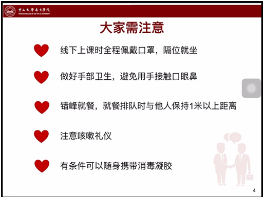 会议伊始,张文婷老师介绍了学校近期为同学们能平安返校所做的防疫准备工作。学校针对校园环境及室内设备进行了清洁和消毒;位于西区的招待所也暂停对外营业,用于校内的隔离场所;各个部门通力配合以细化返校工作,且设立了一系列完备的应急预案以应对突发事件。