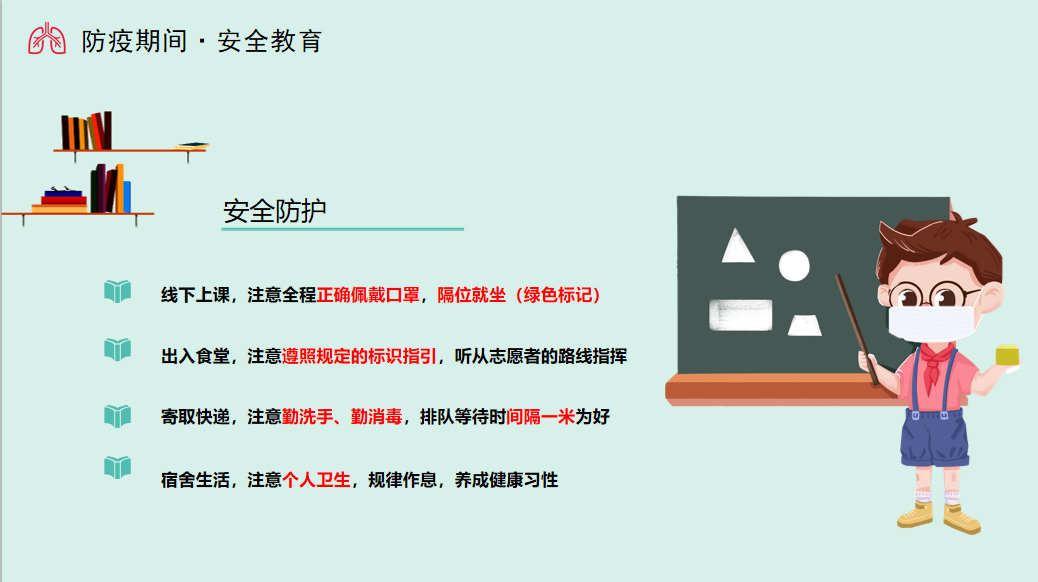 陈老师结合新闻以及真实案例,从安全防护、安全用电、安全出行等三个方面为大家作安全教育。在这一环节,根据近期对已返校学生的观察,陈老师指出部分同学在线下上课、进出食堂、宿舍生活、寄取快递、雨天出行时存在着错误的做法,甚至容易触发安全隐患。因此,陈老师再次叮嘱同学们不要掉以轻心,随时做好消毒防范工作,尤其是在雷雨天一定要注意保护好自己,尽量不要在室外逗留。