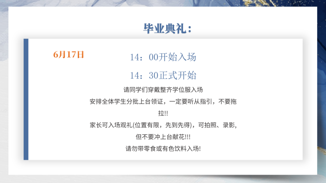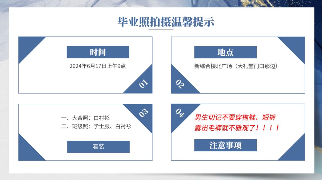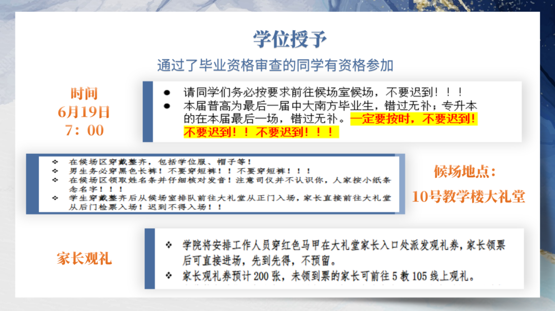 李少君老师与同学们多次强调毕业照拍摄、参与毕业典礼与学位授予的注意事项,鼓励2024届毕业生同学积极参加毕业照拍摄,为大学生涯增添一些美好的回忆。参与毕业典礼与学位授予需要严格遵守会场纪律,勿迟到,并穿戴整齐等!