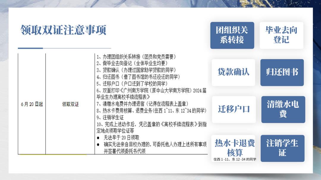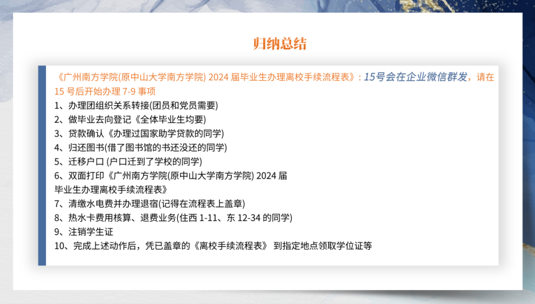黄倩敏老师归纳总结离校前需要办理的业务有以下内容:团员和党员需要办理团组织关系转接、全体毕业生均要做毕业去向登记、办理过国家助学贷款的同学需要贷款确认、借了图书馆的书还没还的同学需要归还图书、户口迁到了学校的同学需要迁移户口、双面打印《广州南方学院(原中山大学南方学院)2024 届毕业生办理离校手续流程表》、清缴水电费并办理退宿(记得在流程表上盖章)、热水卡费用核算、退费业务(住西1-11、东12-34的同学)、注销学生证、完成上述动作后凭已盖章的《离校手续流程表》到指定地点领取学位证等。