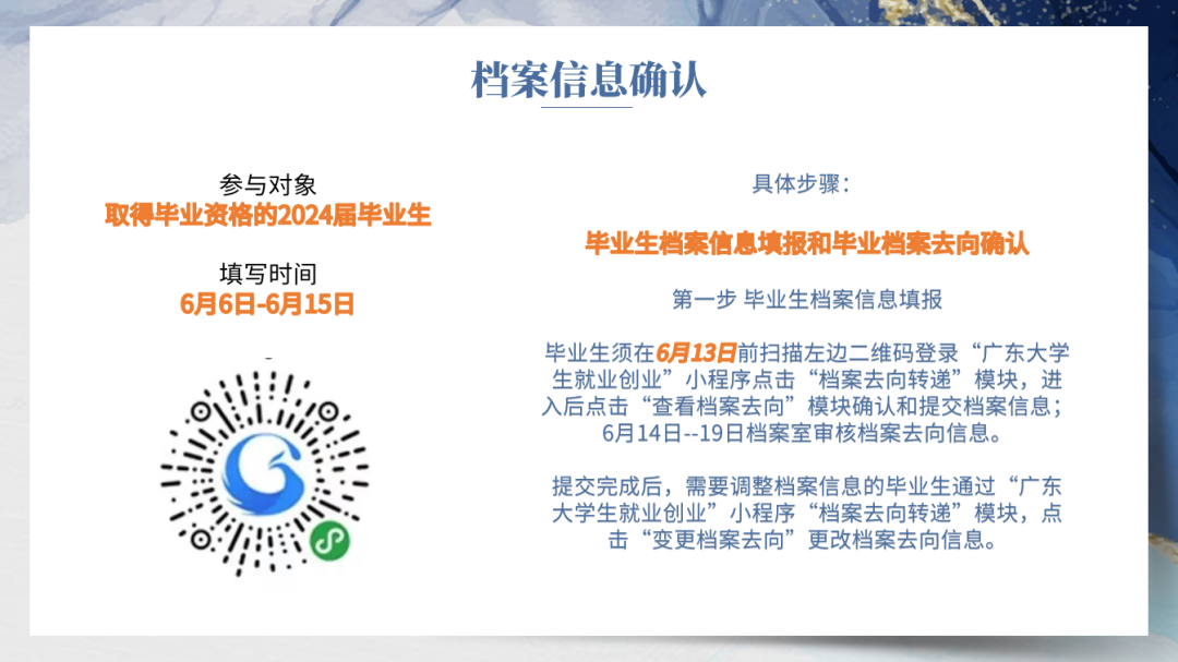 档案资料非常重要,关乎个人未来成长和发展,只有完成了毕业去向登记和确认,同学们的档案才能进行派遣和邮寄。