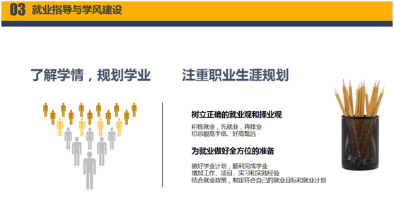 在本环节,孙老师结合就业形势和就业率,跟同学们探讨了树立正确的就业观和择业观的重要性,加强职业生涯规划意识,科学做好职业定位,选择好就业方向,努力学习、积极实践,做好就业准备,切忌眼高手低、好高骛远。为了进一步加强学风建设,孙老师还结合教务数据,提醒同学们了解自身学分、学情,科学规划好自己的学分修读和学业完成情况,结合学业,做到有计划、有目标、有节奏。