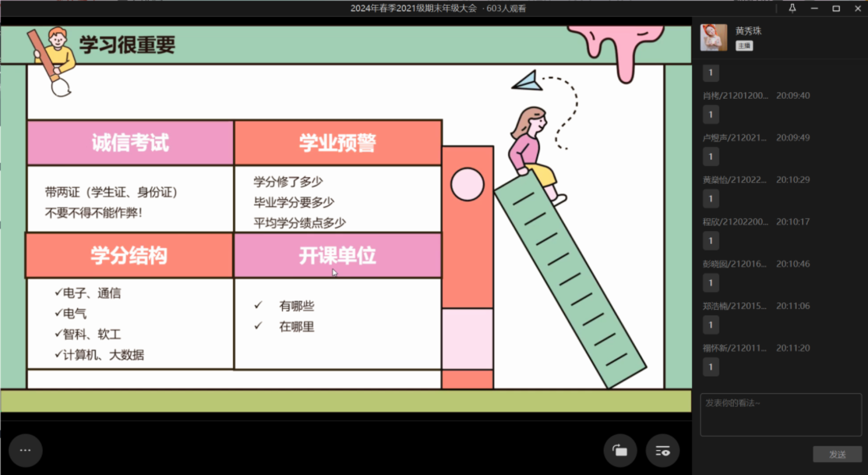 首先,邓惠君老师向同学们强调了离校安全的注意事项,要整理好个人物品,带走贵重东西,离开宿舍前要切断电源,关闭水源,并及时填写离校去向表,告知家人和辅导员去向以及主动报平安。同时邓惠君老师强调同学们一定要注意网络安全,提高自己的防诈骗意识,并且随着大四实习期的到来,也要加强社会实践防诈骗意识。