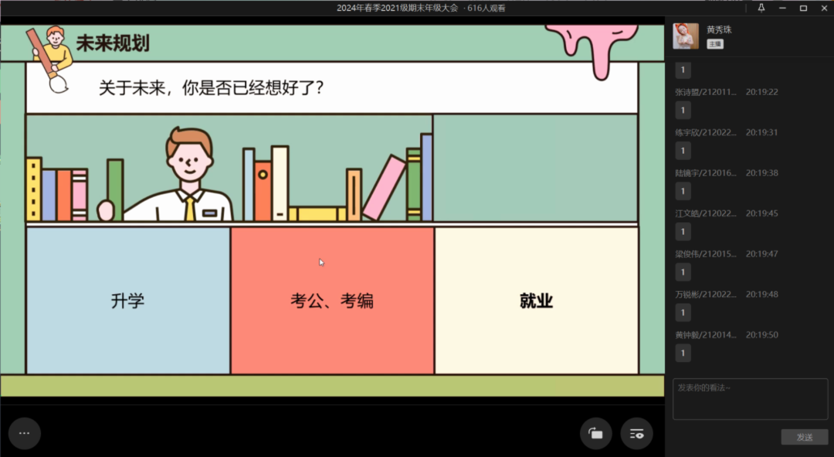 最后,黄秀珠老师给同学们讲述未来同学们发展的主要几个方向:考研、考公考编、就业。提醒同学们要了解自己的兴趣、优势和劣势,这样有助于确定适合自己的职业方向。同时要不断学习新知识和技能,适应不断变化的社会大环境,无论选择哪条职业发展道路,在面对困难和挑战时,都要保持乐观积极的心态,相信自己能克服困难。