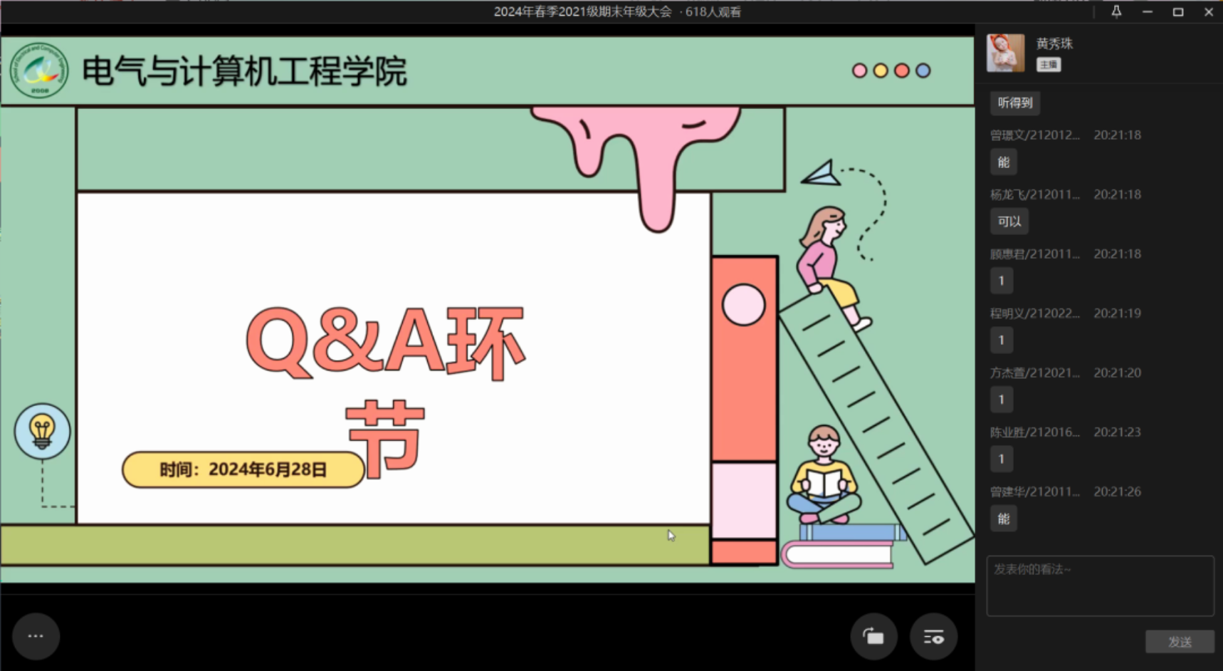 在年级大会的最后,老师们还设置了一个特别环节:Q&A环节。王老师和黄老师在线给同学们就生活、学习、实习等方面问题进行了解答,同学们不仅对相关问题有了清楚的了解,也更加明确了未来发展的方向。至此,本次William威廉官网2021级春季学期期末大会圆满结束。