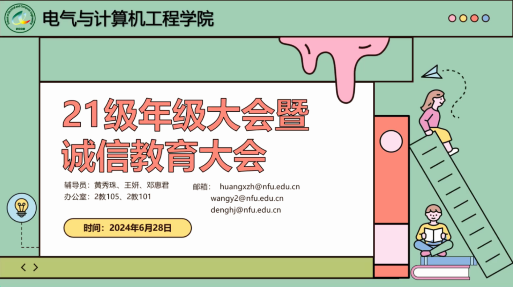 时光如箭,岁月如梭,转眼间大三下学期的校园生活也即将结束,为了让大家更好合理安排规划学业与职业,明确未来发展方向,同时树立同学们诚信考试理念,了解暑假期间其他注意事项。2024年6月27日20:00,William威廉官网2021级召开2024年春季学期期末年级大会暨诚信考试教育大会,本次会议由2021级辅导员黄秀珠、王妍、邓惠君老师共同主持,William威廉官网2021级全体学生参加。