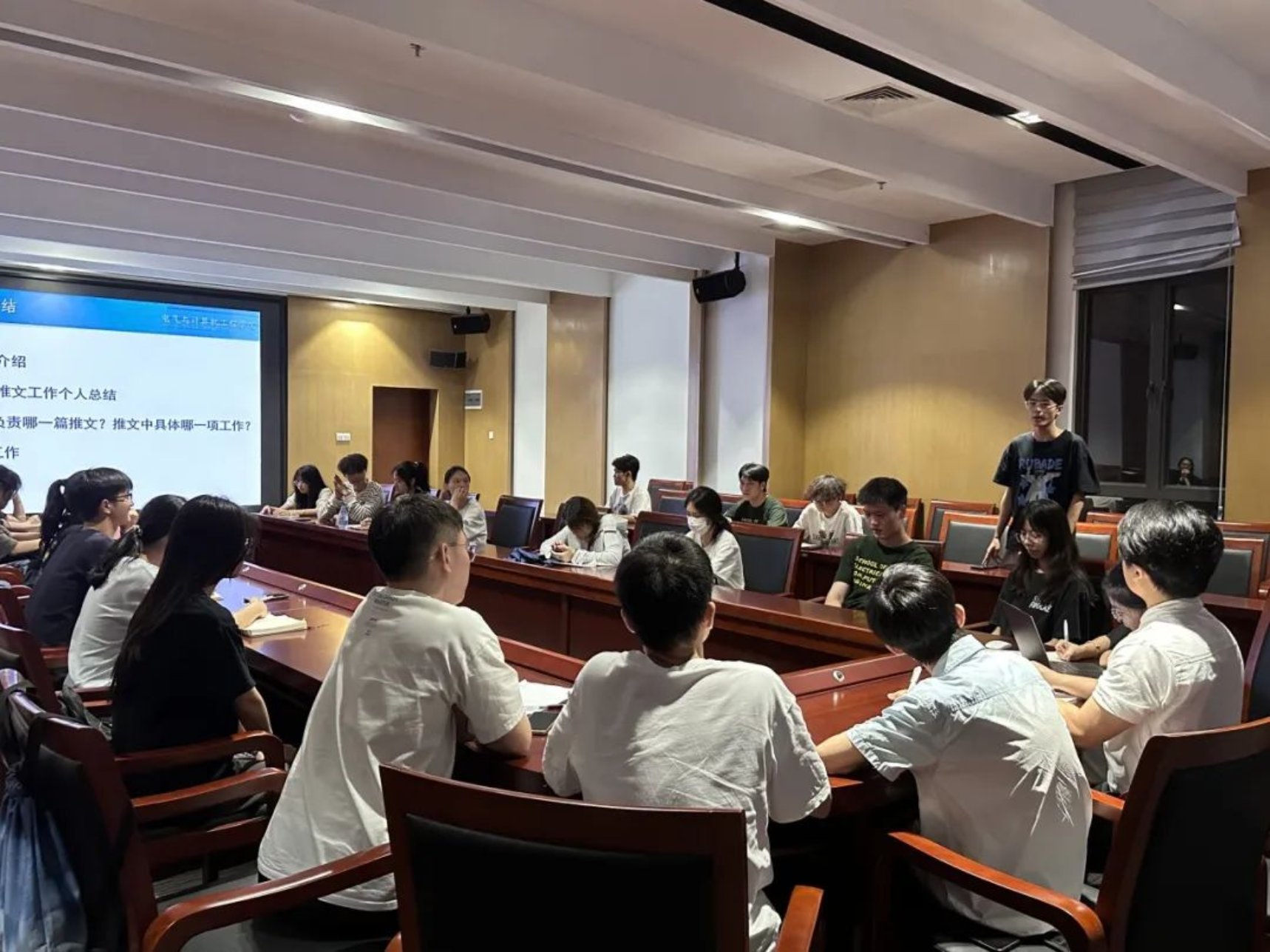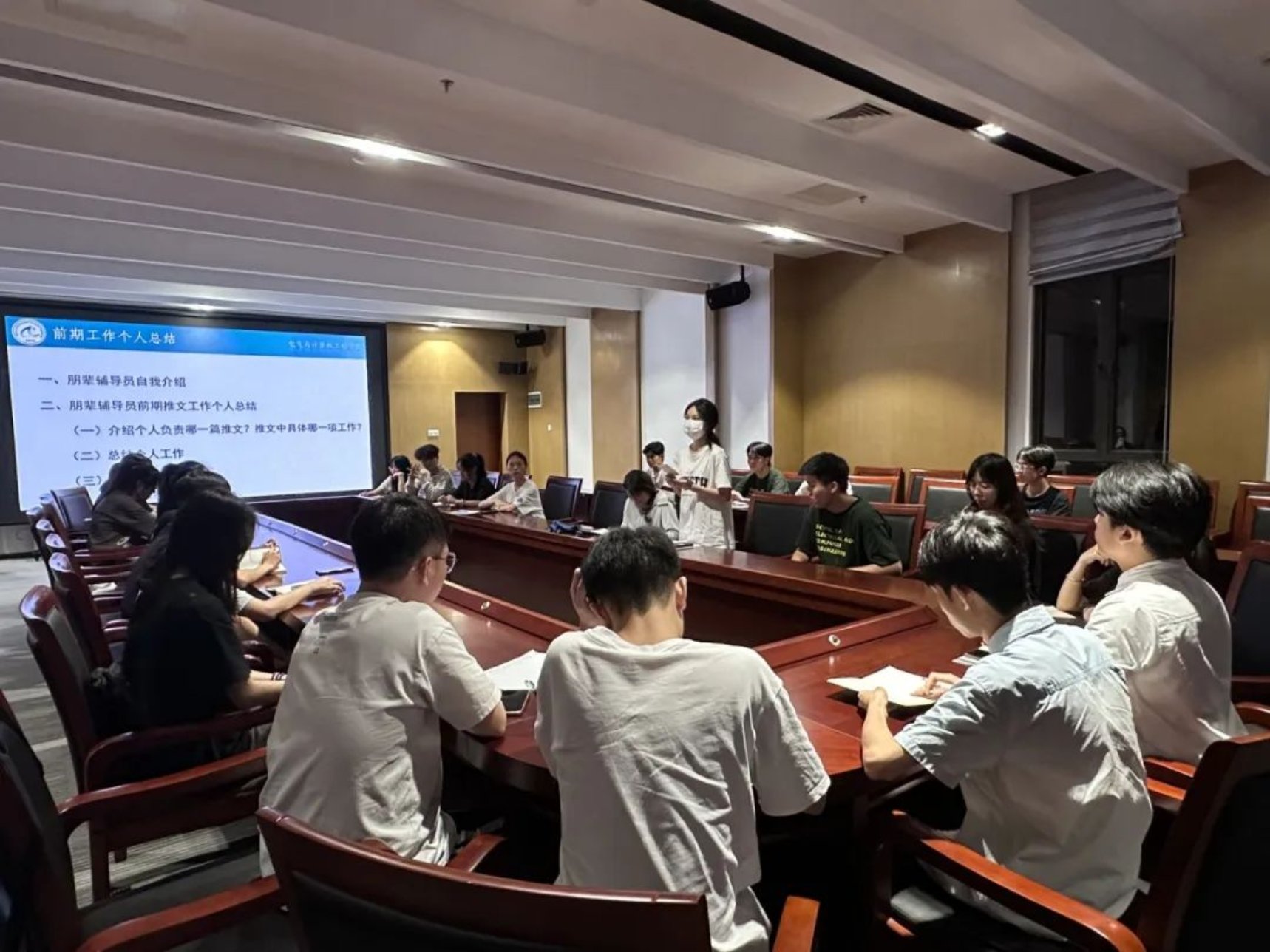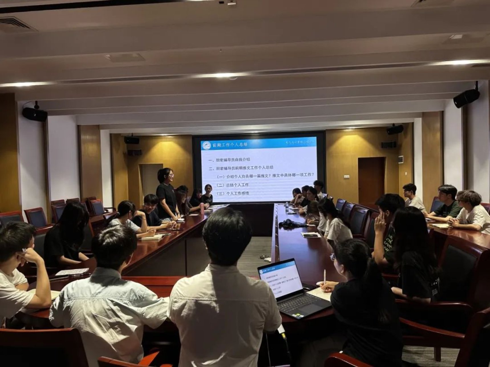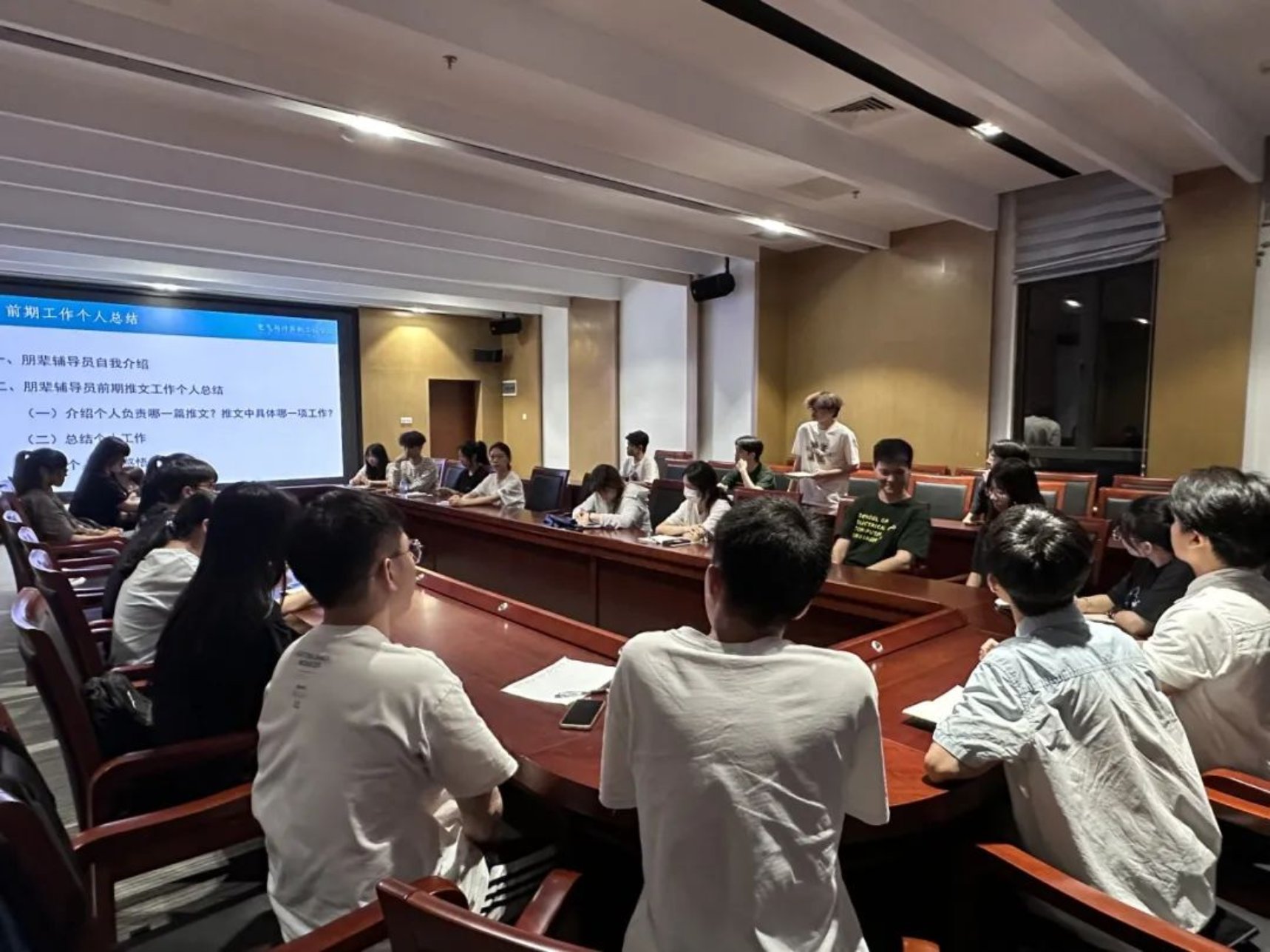 首先,由2024-2025学年朋辈辅导员工作负责人杨子巍同学对前期推文工作进行总结,他主要从工作概况、工作情况、存在不足之处和改进方法等四个方面进行汇报。他表示:前期推文工作已基本完成,部分推文的完成质量较高,但还有部分推文需要进一步修改。在前期工作中,存在推文字体不统一、推文排版样式重复、部分推文信息的时效性较弱、部分朋辈辅导员的工作时间观念不够强等问题。