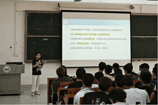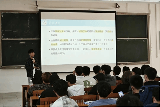 培训伊始,李思阳老师对于班长、副班长、团支书等各班委的主要职责与日常工作内容进行了详细的介绍,着重强调了各位班委应各司其职,紧密协作,不仅要关注同学们的学习生活,更要注重全面发展,引领班级积极向上。讲台上,李老师讲解细致入微且生动有趣;讲台下,新生班委们全神贯注,认真记录要点,并积极踊跃提问,充分彰显出作为班委的强烈责任感与积极态度。